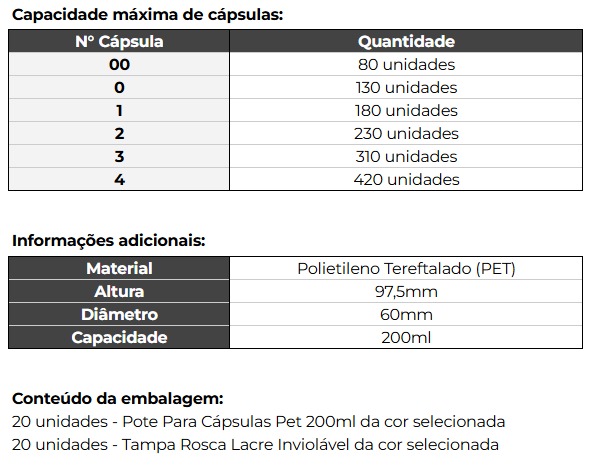 Características e Benefícios Pote Cápsula PET 200ml :