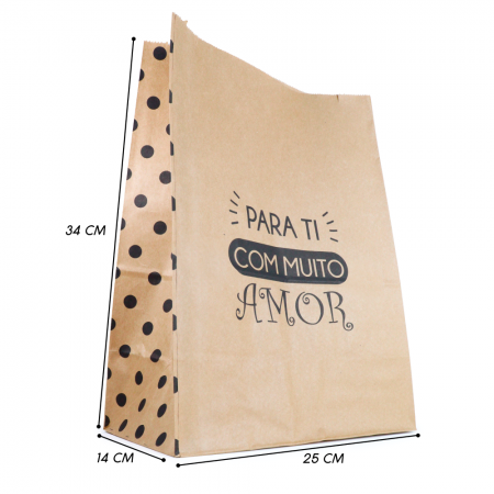 Saco kraft estampado com a frase “Para ti com muito amor”. Embalagem ideal para envio de produtos e delivery.